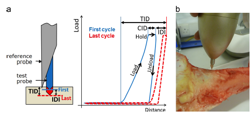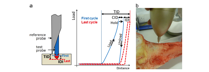 The bone diagnostic instrument is designed to measure materials properties of bone even if it is covered with soft tissue such as periosteum, connective tissueand skin. It uses (1) a probe assembly, consisting of a reference probe that penetrates soft tissue and stops on the surface of the bone and a test probe that is inserted into the bone, (2) an actuation system that can move the test probe, typically into and out of the bone, (3) a sensing system that can determine the dynamics of the test probe as it moves in the bone, and (4) a measurement system to record the data that is sensed during the motion. In our current prototype, a sharpened, solid test probe slides inside a sharpened hypodermic syringe that serves as the reference probe. A load cell senses the force as a function of the distance that the test probe is inserted into the bone relative to the position of the reference probe that rests on the surface of the bone, measured with a linear variable displacement transformer. Examples of the type of data that can be taken with this prototype include cyclic force versus distance curves that show differences in material properties of different types of bone.