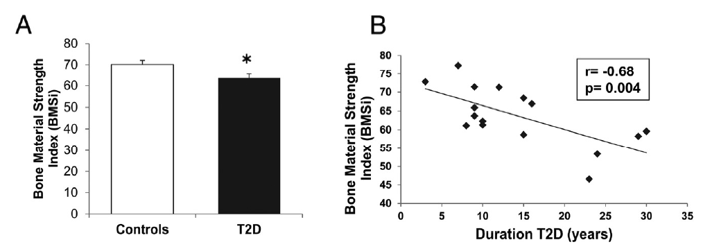 Substantial evidence exists that in addition to the well-known complications of diabetes, increased fracture risk is an important morbidity. This risk is probably due to altered bone properties in diabetes. Circulating biochemical markers of bone turnover have been found to be decreased in type 2 diabetes (T2D) and may be predictive of fractures independently of bone mineral density (BMD). Serum sclerostin levels have been found to be increased in T2D and appear to be predictive of fracture risk independent of BMD. Bone imaging technologies, including trabecular bone score (TBS) and quantitative CT testing have revealed differences in diabetic bone as compared to non-diabetic individuals. Specifically, high resolution peripheral quantitative CT (HRpQCT) imaging has demonstrated increased cortical porosity in diabetic postmenopausal women. Other factors such as bone marrow fat saturation and advanced glycation endproduct (AGE) accumulation might also relate to bone cell function and fracture risk in diabetes. These data have increased our understanding of how T2D adversely impacts both bone metabolism and fracture risk.